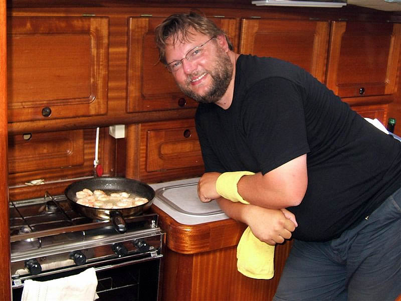 Liepos 29 diena. Kalmaras. Vakaras. "Scampi", arba krevetės, paruoštos kepimui. Šarūnas jas kepa ir valgo. Aš daugiau nebegaliu.